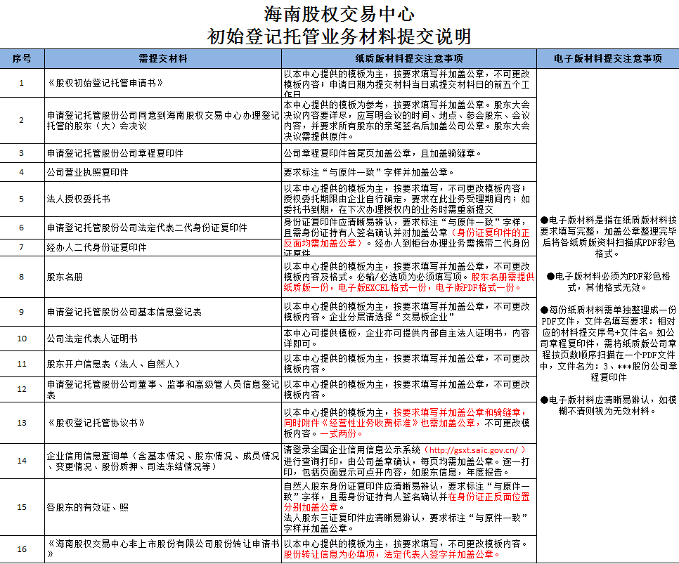 海南股權交易中心初始登記托管業務材料提交說明